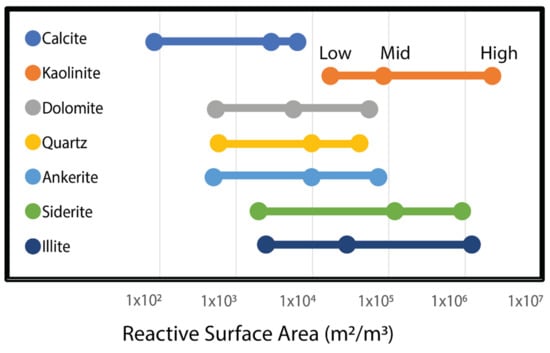 - Qin, F.; Beckingham, L.E. The impact of mineral reactive surface area variation on simulated mineral reactions and reaction rates. Appl. Geochem. 2021, 124, 104852. [Google Scholar] [CrossRef]