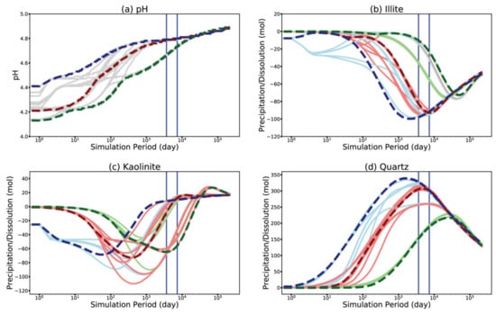 Because the changes of the silicate minerals are much smaller than the total amount of silicate minerals in the model, the mineral reaction rate is a better parameter to illustrate the silicate mineral reactions. The predicted precipitation or dissolution of silicates at the center of the model are shown in Figure 3b–d. For illite and quartz, Case #87 (dashed dark blue line) and Case #86 (dashed dark green line) is the most and the least reactive scenario for these two minerals, whereas Case #85 (dashed dark red line) overlaps with most of the medium cases. On the other hand, changes in kaolinite are more complicated. There are many crossovers and overlaps among results using different kaolinite RSA values, and the deviations between lines in the same color are much greater than those in Figure 3b or Figure 3d. This suggests that the reaction of kaolinite is controlled by not only the RSA of kaolinite but also the RSA of other minerals. Nevertheless, the high RSA cases (blue) predicted prompt and more intense reactions, while the low RSA cases (green) predicted delayed and more restricted reactions.