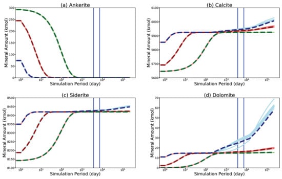 The simulation results of four carbonate minerals, ankerite, calcite, siderite, and dolomite, are shown in Figure 4a–d, respectively. Please note that all 87 cases started with the same initial mineral amounts, and Figure 4 presents mineral amounts since Day 1; therefore, the differences between the starting points of the lines in each subplot indicate the difference in the reactions that occurred during the first day of simulation. For example, the total amount of ankerite in the model was initially about 295 kmol, and dropped to 74 kmol in Case #87 (dashed dark blue line), whereas it dropped to about 245 kmol in Case #85 (dashed dark red line) and to 292 kmol in Case #86 (dashed dark green line), after the first day of simulation.