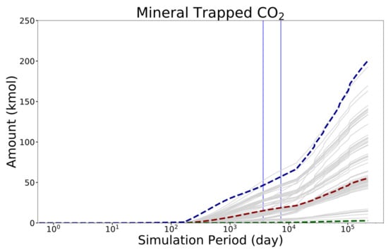 The mineral trapping of CO2 in the simplified model was evaluated with all 87 cases, and the results are presented in Figure 5. There is a much greater deviation among total mineral trapping amount predictions than the predictions for each mineral, as shown in Figure 3 and Figure 4. No clear clustering is observed in Figure 5. While the impact of RSA on each individual mineral is apparent and easier to interpret, its impact on the CO2 trapping mechanism is rather complicated. This is likely due to the different abilities of each mineral to sequester CO2. For example, one mole of precipitated calcite effectively secures one mole of CO2, while for dolomite the ratio becomes 1:2. At the end of the simulation, the amount of CO2 trapped in the minerals ranges from 2 kmol to 200 kmol. The results of three representative cases (#86, #86, and #87) are very close to the median, minimum, and maximum values of all cases, as shown in the dashed lines in Figure 5. Therefore, these cases were selected for reactive transport simulations with the FWU reservoir model.