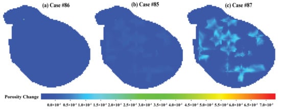 Estimated porosity loss at the end of the CO2-EOR period compared to the initial values for (a) Case #86, (b) Case #85, and (c) Case #87.