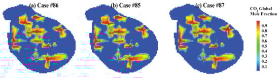 Simulated CO2 global mole fraction at the end of the CO2-EOR period for (a) Case #86, (b) Case #85, and (c) Case #87.
