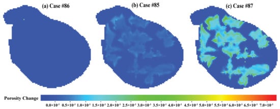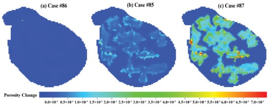 Estimated porosity loss at the end of the simulation period compared to the initial values for (a) Case #86, (b) Case #85, and (c) Case #87.