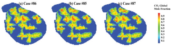 After ten years of CO2-EOR operation, porosity reduction is observed in all three cases. Figure 6 shows changes of porosity due to mineral reactions at the top layer of the Morrow B sandstone using the RSA values of Case #86 (all low RSA values of seven minerals), Case #85 (all mid RSA values), and Case #87 (all high RSA values), respectively. In general, a dominant porosity reduction was observed for all cases. Specifically, Case #86 (Figure 6a) exhibits the most restricted variation, while Case #87 (Figure 6c) presents the greatest porosity change across the layer, showing a maximum porosity reduction of 1.86 10−3 (or 0.9% of the initial porosity). However, very similar CO2 global mole fraction distributions were predicted by three models (Figure 7). This suggests that the mineral reactions have an insignificant impact on the CO2 migration. Given that the CO2 plume shapes are mostly identical among the three cases, the difference in porosity change is attributed to the mineral RSA values.