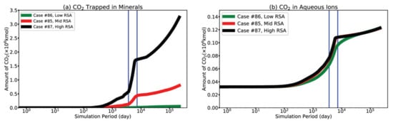 - The impact of mineral RSA values on CO2 mineral trapping, on the whole, is more complex than it is on individual geochemical reactions. However, the three selected cases (with all low, all mid, and all high mineral RSA values) are representative for predicting CO2 trapped in minerals;