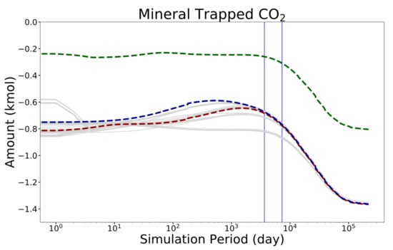 The predicted amount of mineral trapped CO2 in the simplified 3D model. Dashed lines in dark green, dark red, and dark blue indicate Case#86, Case #85, and Case #87, respectively; gray lines denote all other cases, and two vertical lines denote the end of 10 years and the end of 20 years.