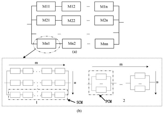 A complex battery system (a battery system composed of any uncertain number of SCM or PCM, etc.) can be regarded, as is shown in Figure 2a. Any unit in Figure 2a can be considered to be composed of two battery subsystems, 1 or 2 in Figure 2b. In topology 1, every SCM is composed of m cells connected in series, and then n SCMs are connected in parallel. In topology 2, each PCM has n cells connected in parallel, and then m PCMs are connected in series.