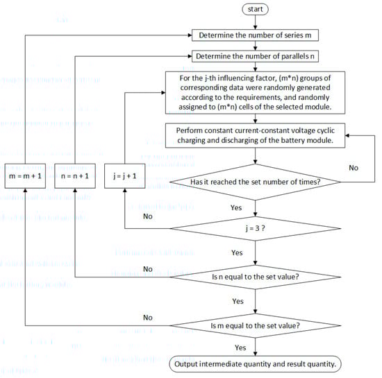 For the selected battery system p of a certain topology, select a certain influencing factor q (the value is the initial capacity, initial SOC, and initial internal resistance). Let this factor randomly generate m × n sets of data within the standard deviation of the simulation parameters shown in Table 1, and randomly assign them to m × n cells of the selected module. At the same time, ensure that the data of other influencing factors of the selected module monomer are completely the same.