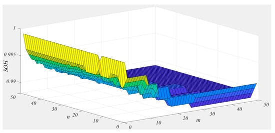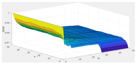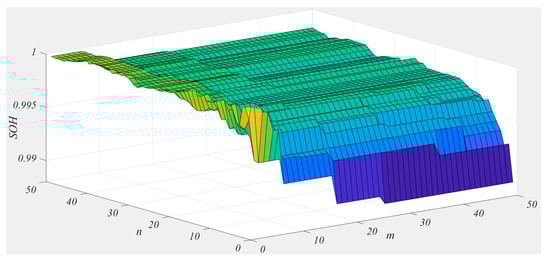 It can be seen from Figure 6 that when the initial SOC of the cells is inconsistent: (1) Under the premise that the value of n is fixed, the battery pack SOH of topology 1 is affected by the inconsistency of the initial SOC. As m increases, it first increases and then stabilizes. (2) Under the premise of a fixed value of m, the battery pack SOH of topology 1 is affected by the inconsistency of the initial SOC and gradually decreases and stabilizes as n increases. (3) From the rate of SOH change, it can be seen that the sensitivity of the battery pack SOH of topology 1 to the initial SOC inconsistency gradually decreases with the increase of n, and tends to 0, and the sensitivity gradually decreases with the increase of m, and tends to 0. That is, for the battery system 2, the sensitivity of its SOH to SOC inconsistency is related to both m and n.
