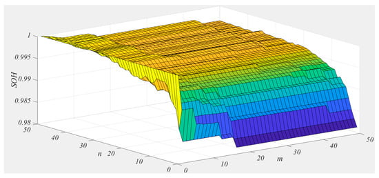Therefore, in topology 1, when n is determined, as m increases, the value of the cells Rij tends to spread across the entire normal distribution, and the difference between Rmax and Rmin is also greater; refer to Equation (22). The SOC difference between the two cells determined by Rmax and Rmin is greater. At this time, according to Equation (5), the capacity of the SCM is smaller, and the SOH of the battery pack is more affected by the inconsistent internal resistance of the cells. When the value of m reaches a certain value, the influence tends to remain unchanged. When m is determined, because topology 1 is SCM in parallel, each SCM can charge and discharge each other. Therefore, when n changes, the influence of the battery pack capacity affected by the inconsistency of the cell internal resistance is not obvious