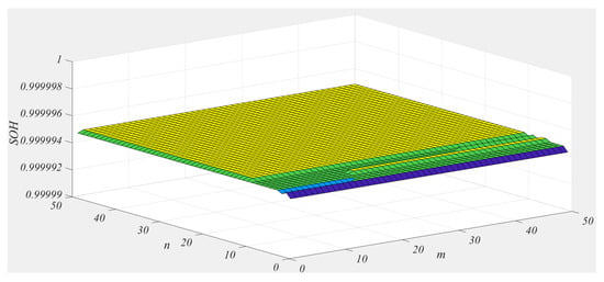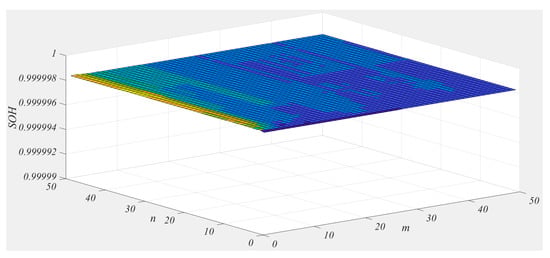 It can be seen from Figure 9 that when the initial internal resistance of the cells is inconsistent, under the premise that the value of m is fixed, the SOH of the topology 2 battery pack is affected by the inconsistency of the initial internal resistance, and there is no obvious change with the increase of n. On the premise that the value of n is fixed, the SOH of topology 2 battery is affected by the inconsistency of initial internal resistance, and it is basically unchanged after a slight decrease with the increase of m.
