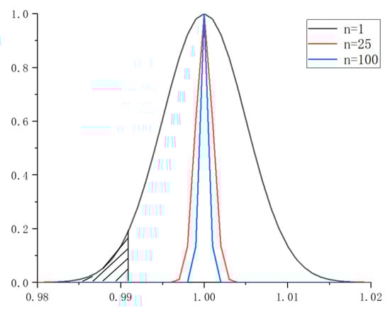 When n is determined, as m increases, the range of the distribution on the left side of the axis of symmetry described in Equation (18) becomes smaller (the shaded part in Figure 10). That is, the value of decreases as m increases, and gradually stabilizes. In other words, when n is determined, the influence of the battery pack capacity is more affected by the inconsistency of the cell capacity as m increases, and tends to be stable.