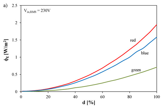 As expected, an increase in the fixed value of parameter d caused an increase in the RMS value of the supplying current, but this increase was nonlinear. In the range of the change in dimming factor d < 30%, the value of the current Iin,RMS was nearly constant. In this range, the input current was consumed mostly by the LED driver, whereas only a small part of this current was consumed by the LEDs. The current decreased with voltage supply. The measurements for a colour LED lamp (Figure 3a) indicate that the highest consumption of current corresponds to red-coloured light, and the least to green-coloured light. This is associated with the spectral sensitivity of the human eye [56]. When analysing Figure 3b, it should be noted that the highest power consumption corresponds to neutral white light, and the lowest—to cold white light. The observed changes in the supplying current correspond to properties of the LED drivers used in the tested lamps. The input current of these drivers depends on the current consumed by the feeding LEDs. In order to obtain the selected value of luminous flux, the red LED needs a much higher current than the blue or the green LED. For the lamp emitting white light of different CCTs, changes in the current Iin,RMS are much smaller than for the lamp emitting coloured light.