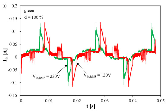 By analysing Figure 9, it can be observed that the LED lamp emitting green light is characterised by a more distorted supplying current waveform. The level of distortions increases with the decrease in the RMS voltage Vin,RMS, which manifests itself in higher distortions of the instantaneous value of the current waveform supplying the LED lamp. It should also be noted that for the LED lamp emitting the green light, the peak-to-peak value of the supplying current does not change with the change in the RMS value of the line voltage and amounts to approximately 250 mA. Analysing the shape of the supplying current of both the values of power supplies of selected LED lamps, the capacitive nature of the impedance of solid-state light sources can be noticed.