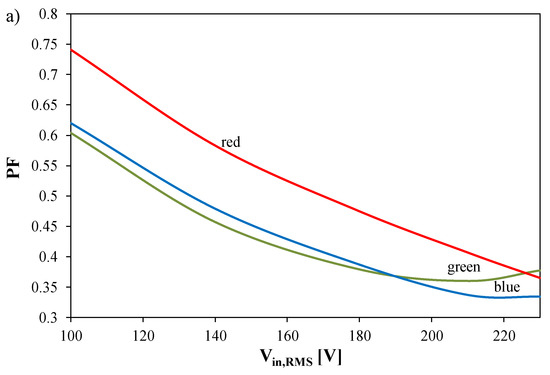 PF values were also calculated using Equation (3) and the calculated values of THD shown in Figure 11. The obtained values of calculations are much higher than the measured values of this parameter. For example, at VinRMS = 230 V, values of the PF are in the range from 0.85 to 0.95, and they are higher than the value declared by the producer in [37]. According to information given in [15], Equation (3) can be used only in the case when the value of THD is nearly zero.