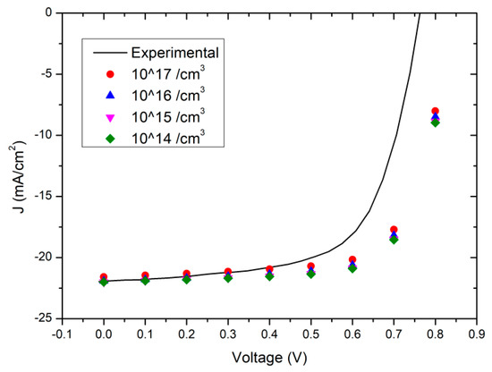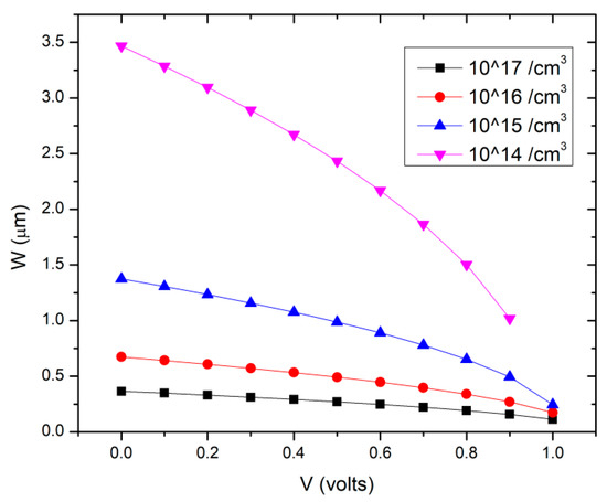 where Eg is the bandgap of CdTe with a value of 1.5 eV [17,20], the offsets of energy level ΔEc and ΔEn of 0.1 eV in CdS-CdTe heterojunction, and ΔEp the offset of Fermi level in p-CdTe. Assuming there is a single dopant in p-type CdTe, Cu substitute of Cd CuCd (0/-) with the transition energy level of 0.22 eV, and density of states in p-type CdTe Nv =1.8 × 1019 cm−3, the calculated Fermi level EF, NA−, and Vbi are listed in Table 1 for CdTe solar cells with different CdTe doping densities NA ranged from 1014 to 1017 cm−3. Due to the non-shallow activation energy levels of the Cu dopants in CdTe, the hole density is a few orders lower than the acceptor concentration. The finding is further supported by the calculation of p-doping limit and donor compensation in CdTe polycrystalline thin-film solar cells [19], which showed in a p-type semiconductor with non-shallow acceptor levels, such as p-CdTe with CuCd impurities, the hole density was 5.6 × 1014 cm−3 under the acceptor concentration of 1.0 × 1017 cm−3 [19]. The dependence of W on V at various doping densities is also shown in Figure 2.