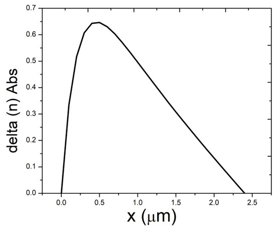 The relationship between ∆n and x of the general solution. x is defined as any position in the neutral region. The unit of ∆n is cm−3.