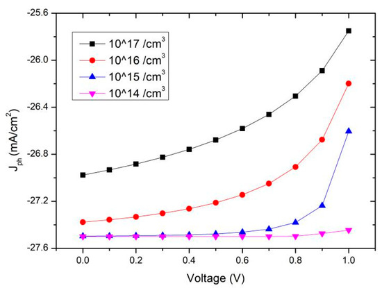 We also plot the photocurrent at different doping densities of p-type CdTe in Figure 7, and it shows the trend of a much heavier dependence of photocurrent on bias voltage at higher doping density while the photocurrent seems to keep constant at a low doping density of 1014 cm−3.