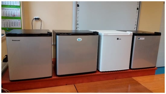 Four thermoelectric refrigerators produced by different manufacturers were selected for the experimental research (Figure 1). The basic technical characteristics of selected refrigerators are presented in Table 2. The examined refrigerators were chosen, because they have similar (declared by the manufacturer and measured) chamber capacity V, however, it was revealed that they have different k and F values.