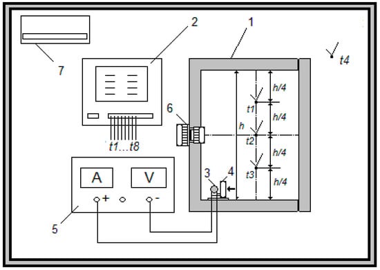 Particular refrigerators were tested separately. The examined thermoelectric refrigerator (object 1 in Figure 2) was placed on the table at a height of 0.80 m from the floor. An 8-channel AR206 type recorder 2 with a data display resolution of 0.1 °C was used to record the temperature. Measurement of all temperatures was carried out with J-type thermocouples installed in accordance with the standards [20,21], as shown in Figure 3. Apart from thermocouples, an electric heater 3 and an axial fan 4, identical to the one placed on the cold side of the thermoelectric unit 5, were installed in the refrigerator cabinet. The heater was powered by a 3010 DC Power Supply 6 with a voltage stability of ≤0.01% ± 2 mV and a current stability of ≤0.2% ± 3 mA. The test stand was located in a room with temperature control ranging from +18 to +25 °C. The air conditioner 7 ensured the accuracy of maintaining the temperature in the range of +0.3 °C.