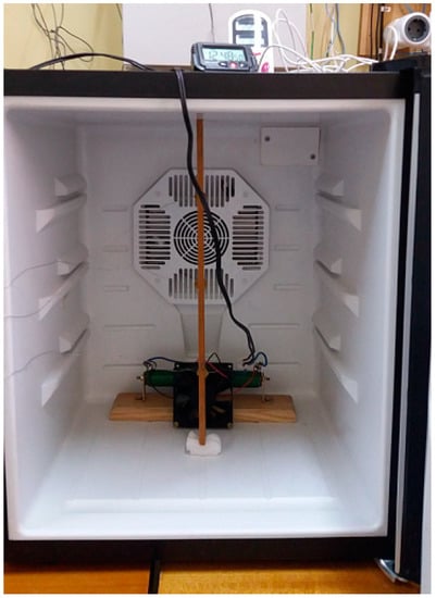 The heater’s power was selected to be as close as possible to the cooling capacity of the refrigeration unit in the energy-saving mode. The fan in the chamber was connected to the power supply in parallel to the heater. This fan maintains the ability to operate under reduced supply voltage from the nominal value of 12 V DC to 5.0–5.5 V DC [49]. Hence, the supply voltage of the heater-fan unit was assumed to be 6.0 V and the voltage stabilization mode was selected. The power parameters were constant during the tests of selected refrigerators. The final values of the current intensity depending on the temperature varied within ±0.01 A.