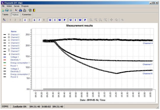 A fragment of the measurements made during the start-up period of the tested Electroline (▽ channel 7) and ChTT-48 (△ channel 6) refrigerators is presented in Figure 4. Similar measurements were carried out for all examined refrigerators. Additionally, devices’ power and energy consumption, as well as voltage were measured.