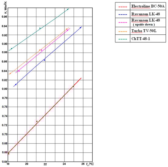 The results of determining the k coefficient on the basis of measurements, using the Equation (4), are presented in Table 3. The difference in the measured k-values of four refrigerators is clearly visible. As expected, the Electroline BC-50A refrigerator, which has a greater insulation thickness, showed the best k coefficient. The measured k-value at an ambient temperature of 22 °C was 0.741 W/m2K. The measurement results conducted for other refrigerators were 15–25% worse.