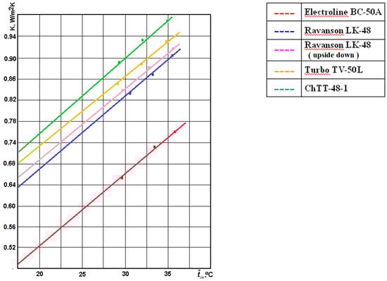 A comparative analysis of k measurement results for Ravanson and ChTT-48 refrigerators is of particular interest, since the second one was built as a result of the modification of the first refrigerator mentioned [24]. The modification covered the complete disassembly of the Ravanson refrigerator unit together with the power supply and temperature control system, as well as replacement of the aforementioned elements with the author’s original unit and specific temperature control system [16]. Two thermoelectric modules instead of one and heat exchangers almost twice as large on both sides of the refrigerator were installed in ChTT-48. As a result of such processing, additional thermal bridges were created, which noticeably worsened the insulating properties of the chamber, as can be observed from the data presented in Table 3, Table 4 and Figure 4. Nevertheless, all unit indicators of the ChTT-48 refrigerator (both Pj and Pk) were significantly improved. It was possible due to three factors: