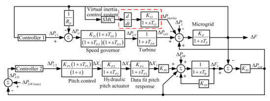 where is the gain of virtual inertia controller, is the time constant of virtual inertia controller for the ESS control and ∆f is the system frequency deviation.