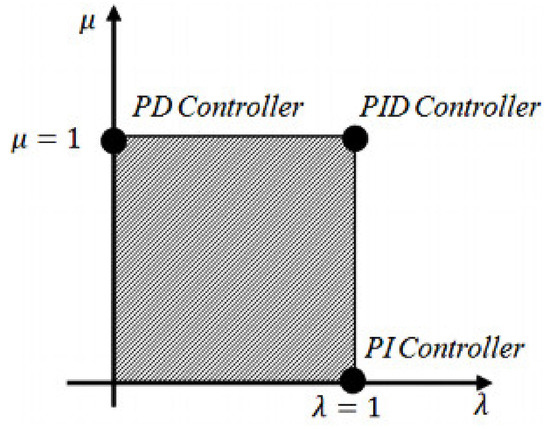 The schematic presentation for conventional PID and FO-PID control system in the λ − µ plane defines the order of the fractional operator. The differential and integral operators’ order may vary along horizontal and vertical axis [37].