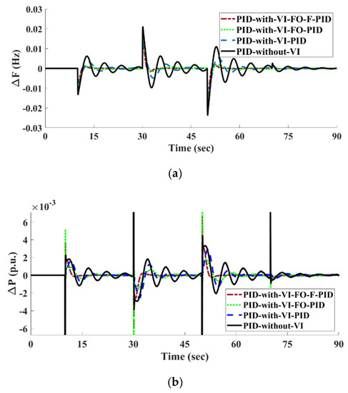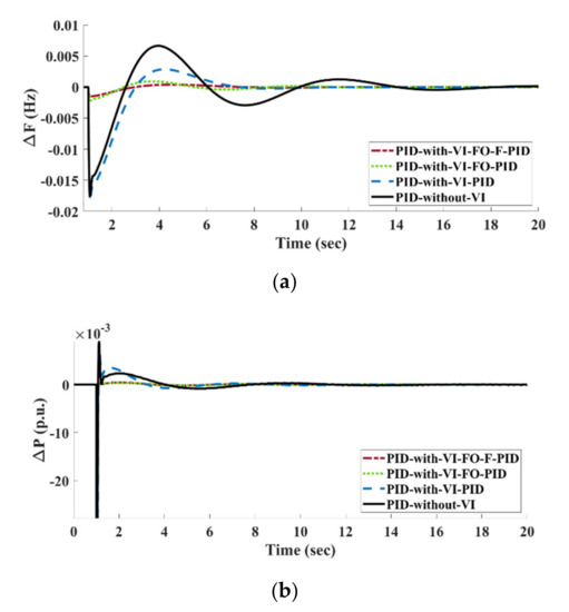 The display of Figure 6 presents the deviation of frequency and power for the studied HPSREG system considering different strategies of control that are named as “PID-With-VI-FO-F-PID”, “PID-With-VI-FO-PID” “PID-With-VI-PID” and “PID-without-VI” for simulation purpose under the impact of a 10% SLP.