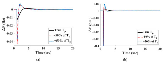 Figure 9 demonstrates the frequency and power deviation profiles due to the change in the value of (gain parameter for the power system block of HPSREG). Moreover, the deviation in frequency and power due to change in (time constant parameter for the power system block of HPSREG) has been presented in Figure 10. From Figure 9 and Figure 10 and Table 5 and Table 6, it may be noted that the system performance has not been affected to a remarkable value, therefore Table 5 and Table 6 and Figure 9 and Figure 10 vouch for the robustness of the studied HPSREG with the virtual inertia control-based on FO based fuzzy PID controller.