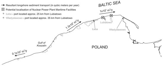 Studies complying with the above recommendations contain all situations for nuclear power plants erected on rocky coasts. The situation is different for plants erected on sandy, erosive coasts. Every technical object (e.g., pipeline, provisional pier for delivery of materials to the site) erected on a sandy coastal segment causes disturbance in natural sediment transport processes and produces local areas of coastline erosion/accretion []. Disregard of the scale, extent and intensity of natural alongshore sediment transport or failure to evaluate possible shoreline change in investigating a potential location for a nuclear power plant on a sandy coast may have serious consequences for its safety [,].