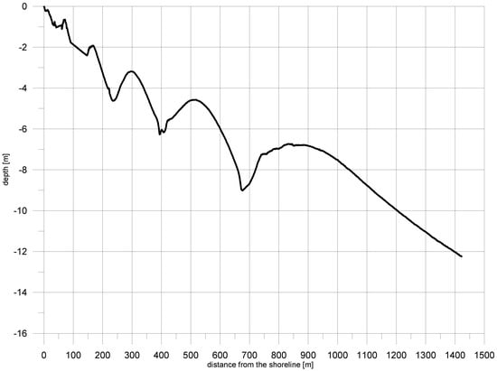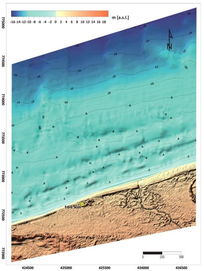 Seasonal and long-term changes in the coastline location range from about 10 to 100 m—Figure 5 []. Changes in the seabed level (ordinate) from a depth of about 4–6 m to the shoreline, due the onshore and offshore migration of sandbars, amount to about 5 m over the last 30 years.