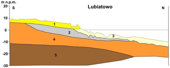 Synthetic geological cross-section (after the Geodynamic Map of the Polish Coastal Zone of the Baltic Sea on a scale of 1:10,000 []). Explanations: 1. aeolian sands in dunes and covers; 2. biogenic sediments (peat, gyttja, mud, etc.); 3. marine and beach sands; 4. fluvioglacial sand and gravel; 5. loam.