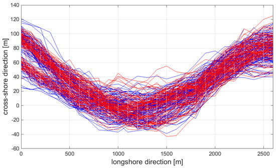 Coastline position at the Coastal Research Station in Lubiatowo in 1983–2007 (red lines denote measurements in spring–summer seasons, blue lines denote measurements in autumn–winter seasons).