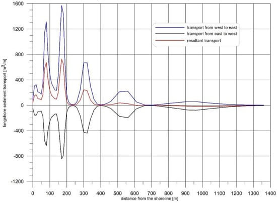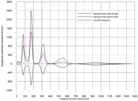 The calculated total amounts of sediment transport do not provide information on how this transport is distributed in the coastal zone, where its intensity is the highest and how far it reaches from the shore. In order to answer these questions, Figure 6 and Figure 7 show the calculated distributions of the longshore sediment transport as a function of distance from the shore for the total west–east transport, the total transport in the opposite direction and the resultant transport in the bathymetric profile shown in Figure 3.