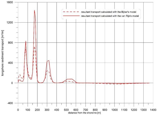 For the purpose of comparison, Figure 8 shows the resultant sediment transport calculated with Bijker’s and van Rijn’s models. It follows from the figure that the distributions obtained are almost identical, only the maximum values are different.