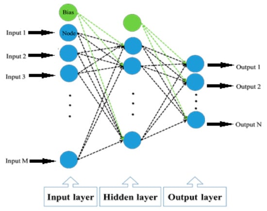 Input nodes receive the data. Each node assigns (i.e., multiplies) a specific weight factor (W), and the obtained value is added to a bias factor (b). Lastly, an activation function (f) is applied to the whole term to generate the proposed neuron’s response. It is mathematically expressed by Equation (1) as follows: