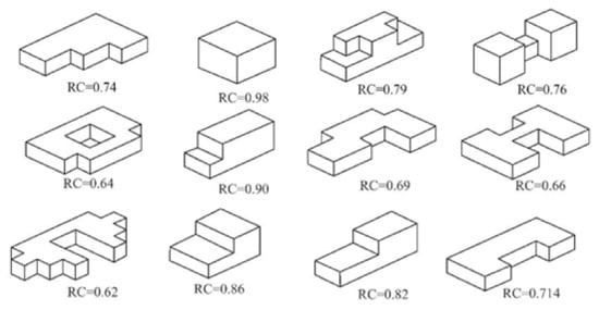 Note that the orientation consists of the north, east, south, and west, the GA receives four values of 0%, 10%, 25%, and 40% of the floor area [,], and the GAD is classified into six groups as follows: (i) uniform (one-fourth glazing on each side), (ii) north: 55% on the north and 15% on the remaining sides each, (iii) east: 55% on the east side and 15% on the remaining sides each, (iv) south: 55% on the south side and 15% on the remaining sides each, (v) west: 55% on the west side and 15% on the remaining sides each, and (vi) no glazing areas []. Figure 2 shows the types of building with respect to the RC, which are mostly orthogonal polyhedral adapted from [].