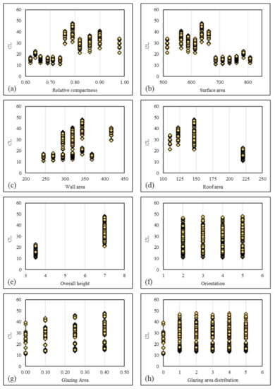 By analyzing 12 different buildings (with a total volume of 771.75 m3), the HL and CL [] of 768 cases are collected when relative compactness (RC = , which indicates the ratio between the surface area (A) and the corresponding volume (V) []), surface area (SA), wall area (WA), roof area (RA), overall height (OH) [,], orientation, glazing area (GA, indicating the overall area measured using rough opening consisting of the glazing, frame and sash []), and glazing area distribution (GAD, indicating the distribution of the GA within the entire building) [] are taken as influential parameters (i.e., independent factors).