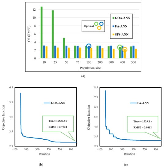 The size of the working population is an influential factor for the performance of the implemented ensemble models. Thus, a trial-and-error process is adopted to ensure that the best population size is used during the optimization. Each model is implemented with nine population sizes of 10, 25, 50, 75, 100, 200, 300, 400, and 500, and the RMSE of the latest iteration is recorded as the best response. The results are shown in Figure 4a. As is seen, the best optimization results for the GOA, FA, and SFS algorithms with 400, 100, and 400 population sizes, respectively. The optimization curves of the mentioned structures are also shown in Figure 4b–d. The other parameters of the SFS algorithm (maximum diffusion = 2 and the type of walk that was the first Gaussian walk) and three parameters of the FA algorithm (α = 0.5, β = 0.2, and γ = 0.1) were manually tuned based on previous experiences or by trial and error. These models are then used to estimate the CL.