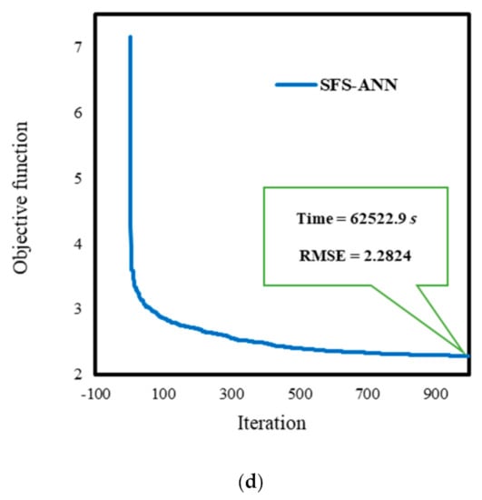 Next, the predictive structure of the proposed MLPNN is provided to the GOA, FA, and SFS algorithms to construct the hybrid models. Given the training dataset, these algorithms try to find highly optimized weights and biases to build an efficient MLPNN. A total of 1000 repetitions is considered for each algorithm to have enough convergence. For each iteration, an evaluation is carried out by means of an objective function, which is set root mean square error (RMSE) in this study. The RMSE is formulated as follows:
