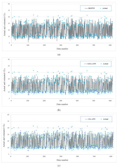 The measured CLs versus those predicted by (a) MLPNN, (b) GOA–ANN (GOA-optimized artificial neural network), (c) FA–ANN (FA-optimized artificial neural network), and (d) SFS–ANN (SFS-optimized artificial neural network) models.