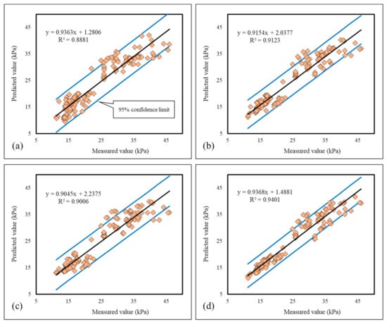 The consistency of the measured CLs with those predicted by (a) MLPNN, (b) GOA–ANN, (c) FA–ANN, and (d) SFS–ANN models in the testing phase.