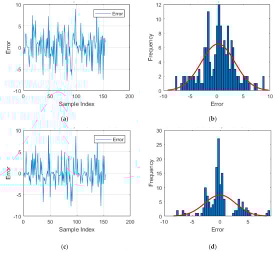 Moreover, the evaluation of the accuracy is conducted by measuring the error of testing data. In this sense, Figure 7a to h depicts the calculated error (= measured CL–predicted CL) for each sample, along with the histogram them showing the frequency of errors in specific ranges. The calculated RMSEs of 3.1663, 2.7628, 2.9411, and 2.2828 indicate around 12.74%, 7.11%, and 27.90% reduction in generalization error of ANN by using the GOA, FA, and SFS techniques, respectively. As for MAE, these values are 22.89%, 17.54%, and 35.56%, as the mean absolute error fell down from 2.4575 to 1.8951, 2.0265, and 1.5836.