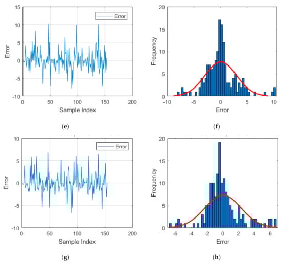 Direct errors and their frequency drawn for the testing results of (a,b) MLPNN, (c,d) GOA–ANN, (e,f) FA–ANN, and (g,h) SFS–ANN.
