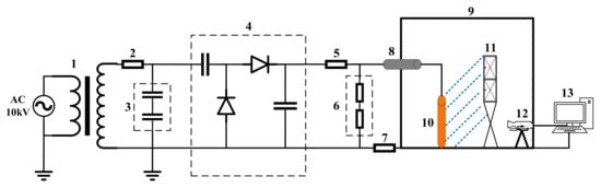 Test setup of the artificial contamination rain flashover test. (1) Test transformer; (2) protective resistor; (3) alternating current voltage divider; (4) direct current supply; (5) protective resistor; (6) direct current voltage divider; (7) leakage current measuring sensor; (8) high voltage bushing; (9) test chamber; (10) specimen; (11) artificial rainfall system; (12) camera; (13) control system.