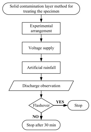 The specimens were treated by the solid contamination layer method before the flashover test [16,17]. Salt deposit density (SDD) and non-soluble deposit density (NSDD) were parameters that characterized the surface contamination severity on the insulators. In this study, the values of SDD and NSDD were 0.03 mg/cm2 and 0.18 mg/cm2, respectively. The converter station played an important role in the whole EHV (Extra-High Voltage)/UHV DC project, the site selection of which needs a strict geological, hydrological, meteorological, and natural environmental survey and investigation. Therefore, the pollution severity of the station usually belongs to the light level [18]. The selection of the test values of SDD and NSDD mainly considered the actual operation experience. According to previous measurement, the average value of SDD was about 0.03 mg/cm2 and the ratio of SDD to NSDD for ultra-high voltage (UHV) post insulators in South China was 1/6.