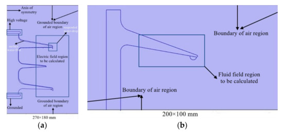 In the electric field simulation, properties of materials and boundary conditions is illustrated in Table 3 and Figure 3. In order to improve the computational efficiency of the computer’s random-access memory (RAM), the dimension of the established model was reduced proportionally according to the actual size of the test sample. The value of the voltage set at the high voltage end of the model was 100 kV DC.